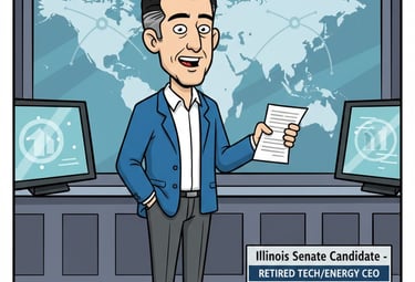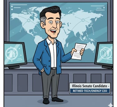 Moderate conservative right Leaning Independent Candidate running for Senate Seat In Illinois- Talks like he has Marbles in his mouth but soothing to the ear. He is about 60's with jet black hair, little light grey on the sides. Dresses with blue sports coat and white collar shirt and no tie. His slacks are grey. Retired business entrepreneur in Tech and Energy.